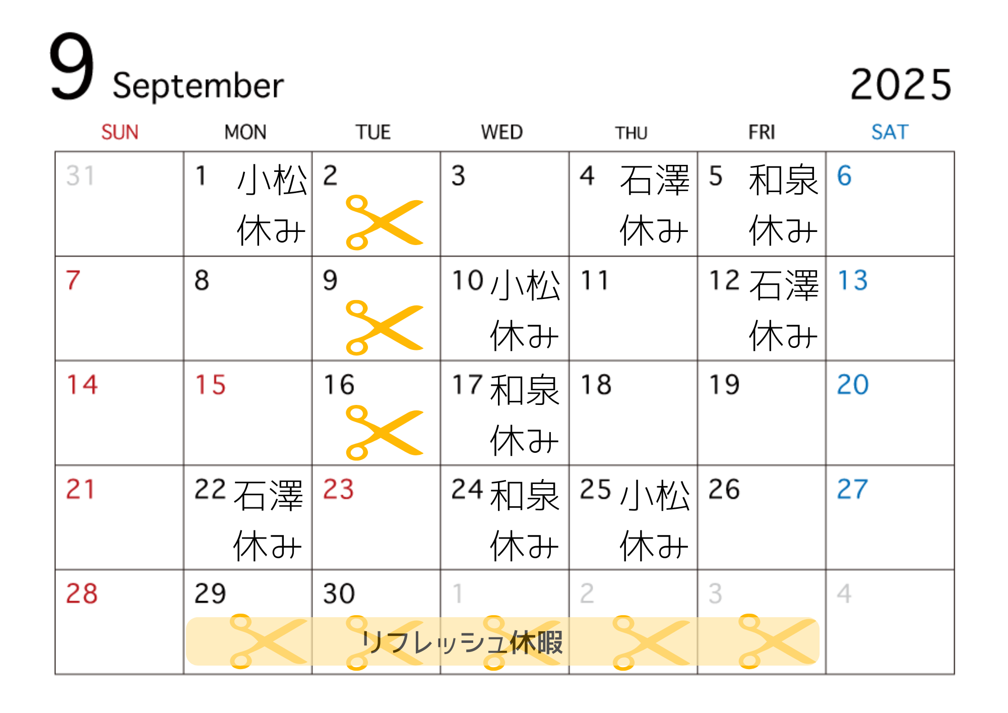 2025年9月の店休日&リフレッシュ休暇のお知らせ