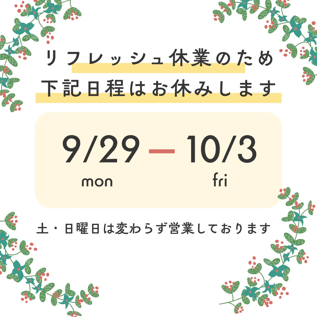 2025年9月の店休日&リフレッシュ休暇のお知らせ